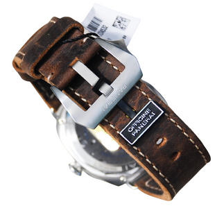 Think vintage with this one. Super cool strap and the blue accents make this unique Panerai really pop. I’ve seen this one on barber’s , doctor’s and even an Indian Motorcycle Rider’s wrist! Very cool stand out piece. MSRP of $8500, this watch can be yours for under the MSRP, which is UNHEARD of for a brand new timepiece these days!